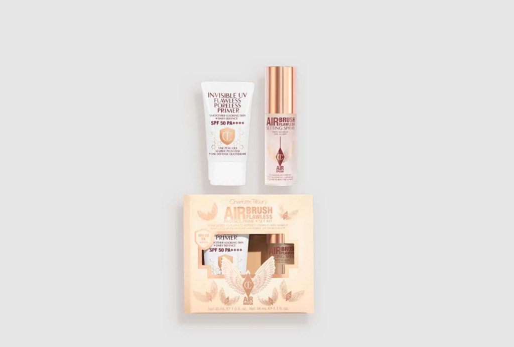 The set includes two of Charlotte Tilbury‘s star products: Airbrush Flawless Primer and Airbrush Flawless Setting Spray. First, Airbrush Flawless Primer is a powerful makeup primer that smooths the skin, reduces the appearance of pores, and provides a long-lasting base for your makeup. Its lightweight, elastic texture helps lock in moisture, making your makeup more even and natural. For those with large pores or uneven skin tones, Airbrush Flawless Primer significantly improves skin smoothness and ensures a flawless finish.